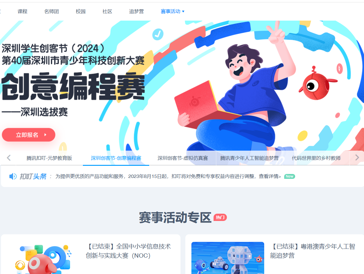 腾讯扣叮积极举办各类编程比赛和活动,如全国中小学信息技术创新与实践大赛(NOC)和粤港澳青少年人工智能追梦营等。这些活动为学生提供了展示和交流的平台,同时也提升了学生的竞技能力和团队合作精神。此外,学生在平台上还可以分享自己的编程作品,如游戏、动画等,激励更多的学生学习和创造。