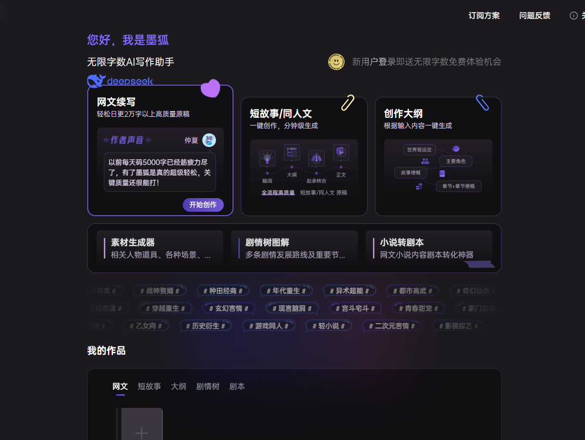 - 适用人群:墨狐AI主要适用于网文小说作者、同人文创作者、剧本创作者以及各类写作爱好者。无论是新手还是资深作者,都可以通过墨狐AI提高创作效率和质量。