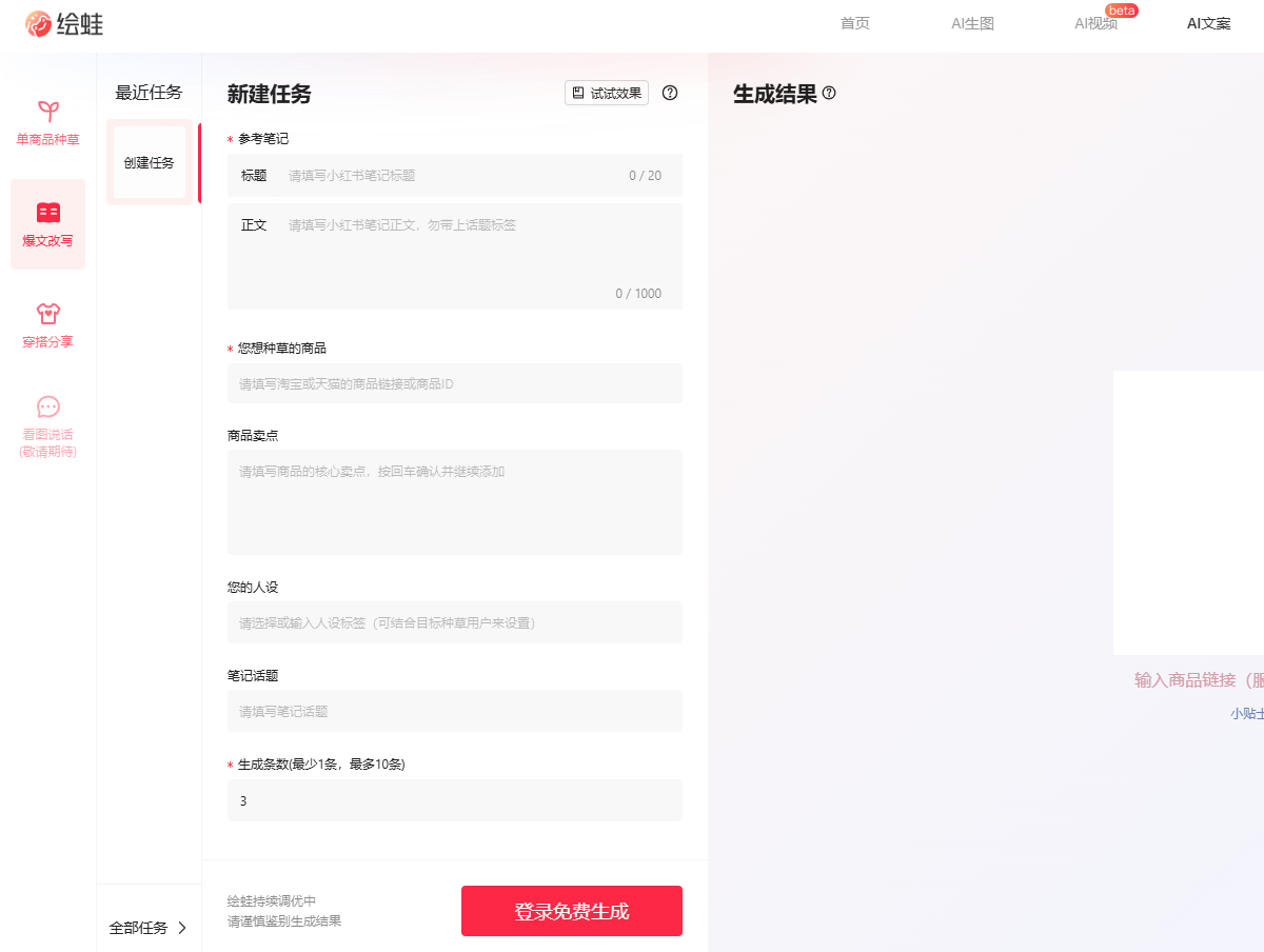 - 选择功能:在绘蛙AI文案平台的首页,选择需要的功能,如商品种草、爆文改写、穿搭分享等。