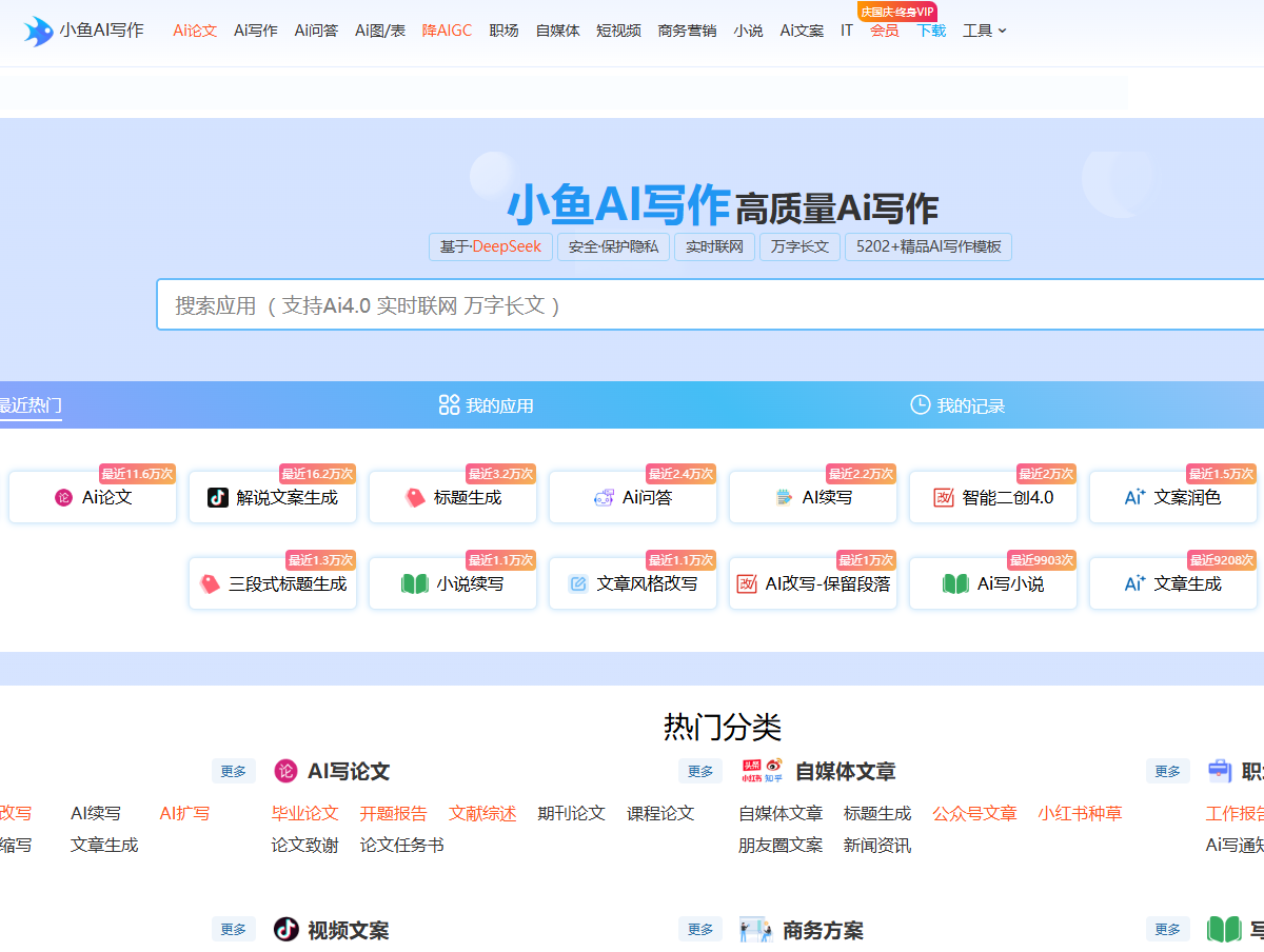 小鱼AI写作是一款基于人工智能技术的智能写作平台,由北京小鱼科技研发,致力于通过AI技术为用户提供高效、便捷的创作服务。该平台覆盖自媒体、办公、学术、营销等多场景需求,功能涵盖智能写作、内容生成、文章优化、智能改写等,支持多语言及多平台使用。