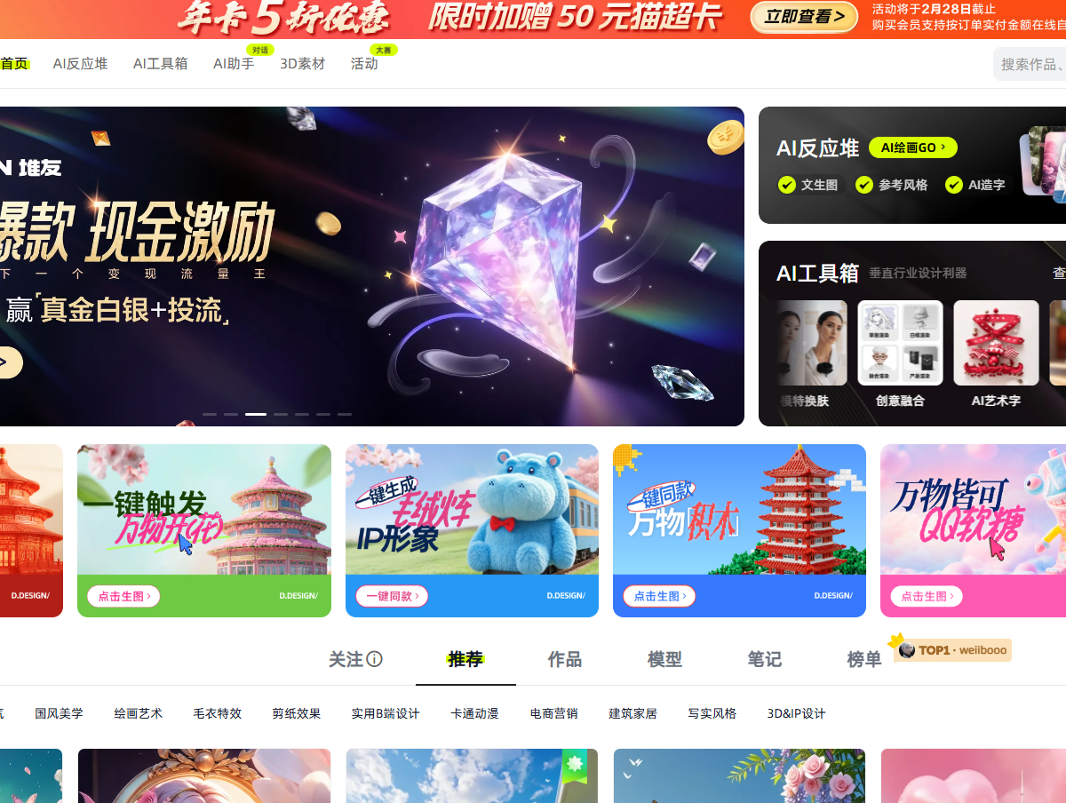 - 堆友平台:由Alibaba Design打造的设计师全成长周期服务平台,围绕品质、效率、技能、成就、收入五大用户价值布局平台能力,全力服务设计师,旨在成为设计师的好朋友。堆友历经阿里巴巴设计团队、算法团队联合多轮打磨,通过AI反应堆精简/进阶版、AI工具箱、3D编辑器、设计大赛等能力模块持续服务不同阶段的设计师。