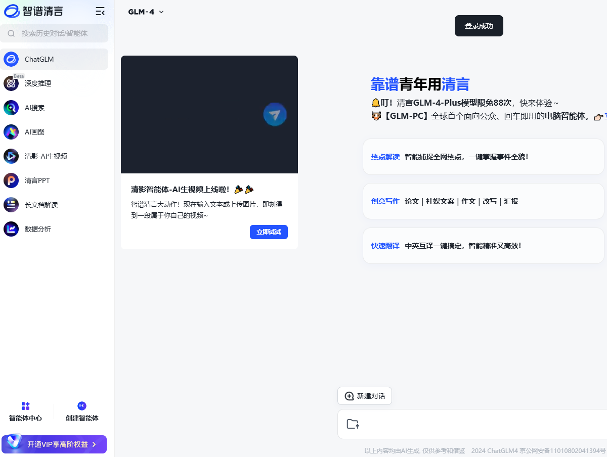 - 使用平台:可在智谱清言PC端和APP端使用,同时清影(Ying)API也同步上线大模型开放平台bigmodel.cn