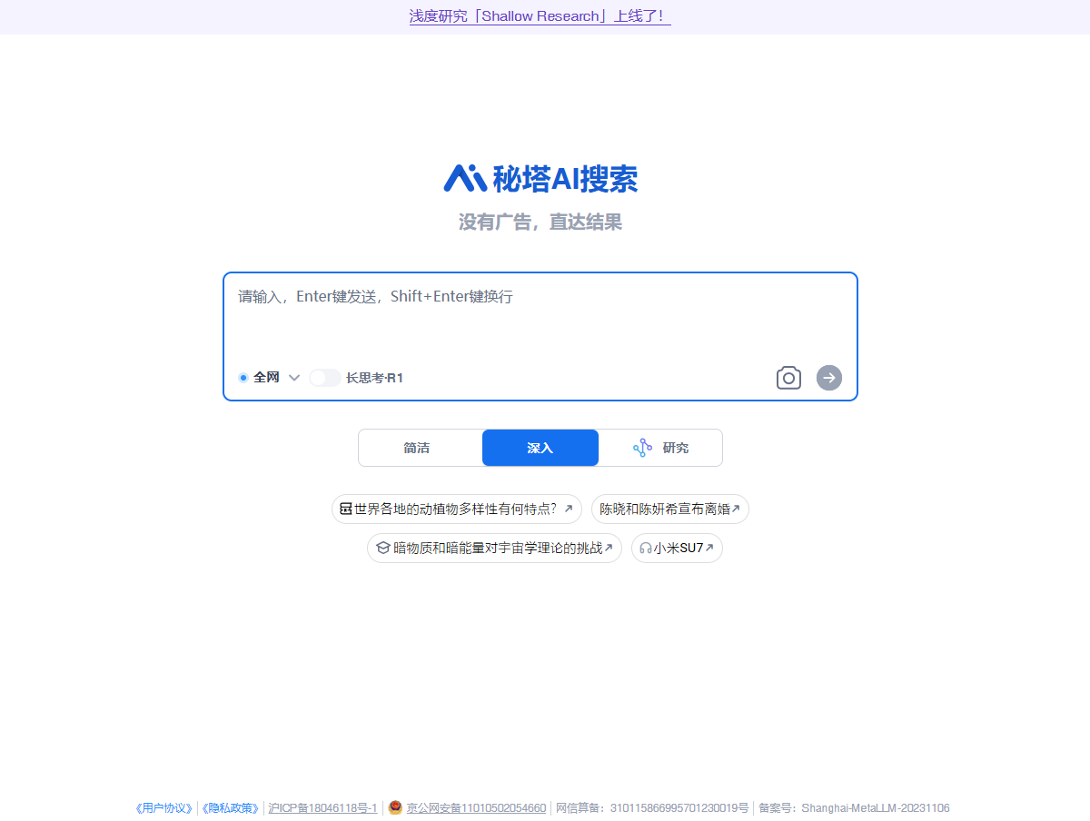 - 其中,“先想后搜”研究模式采用“小模型+大模型”协同架构,将深度推理的框架思考与步骤拆解交给DeepSeek R1完成,信息搜索与资料整合则由秘塔自研模型承担。该模式可以让模型先提出思考框架与路径,再进行资料的整合与分析,能在2至3分钟内完成数百个网页的搜索与分析,大幅提升搜索效率。