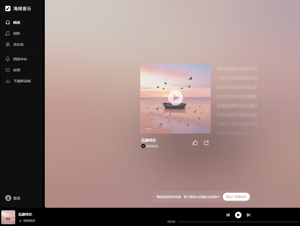 - 海绵音乐的界面简洁明了,操作简便易懂。用户只需输入灵感或歌词,即可快速生成音乐作品,无需具备专业的音乐知识和技能。